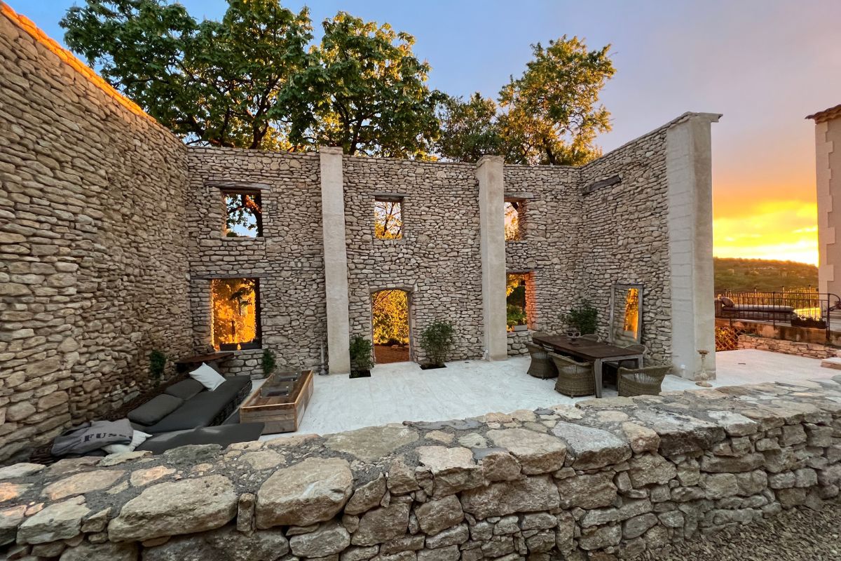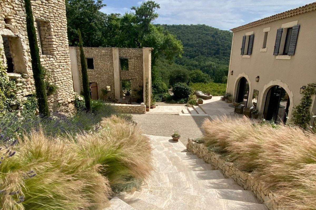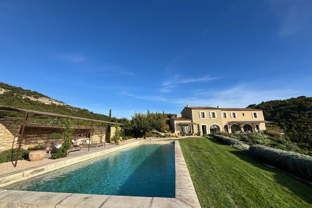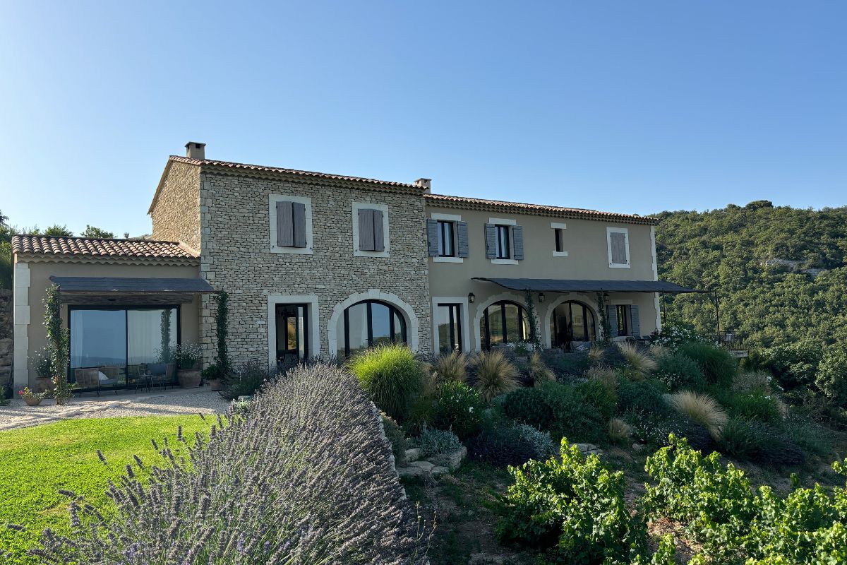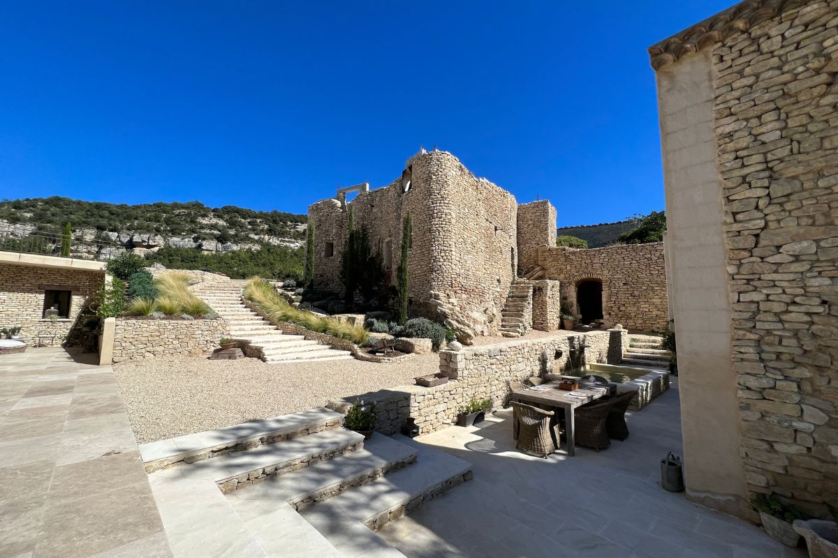 Perched high on a mountainside yet just 5–10 minutes from various villages, this exceptional stone mas sits on 8,784 m² of private land with sweeping views across the valley, cliffs, and Mont Ventoux that stretch in nearly every direction.