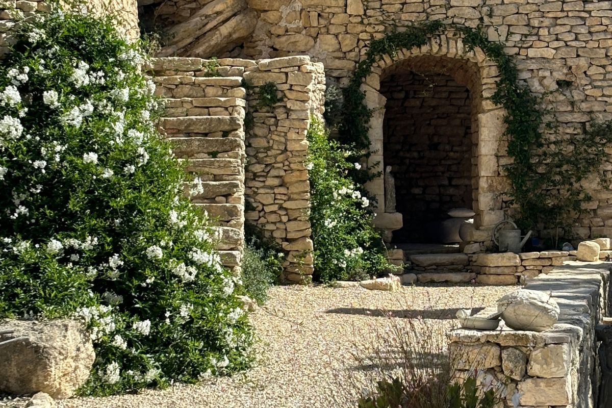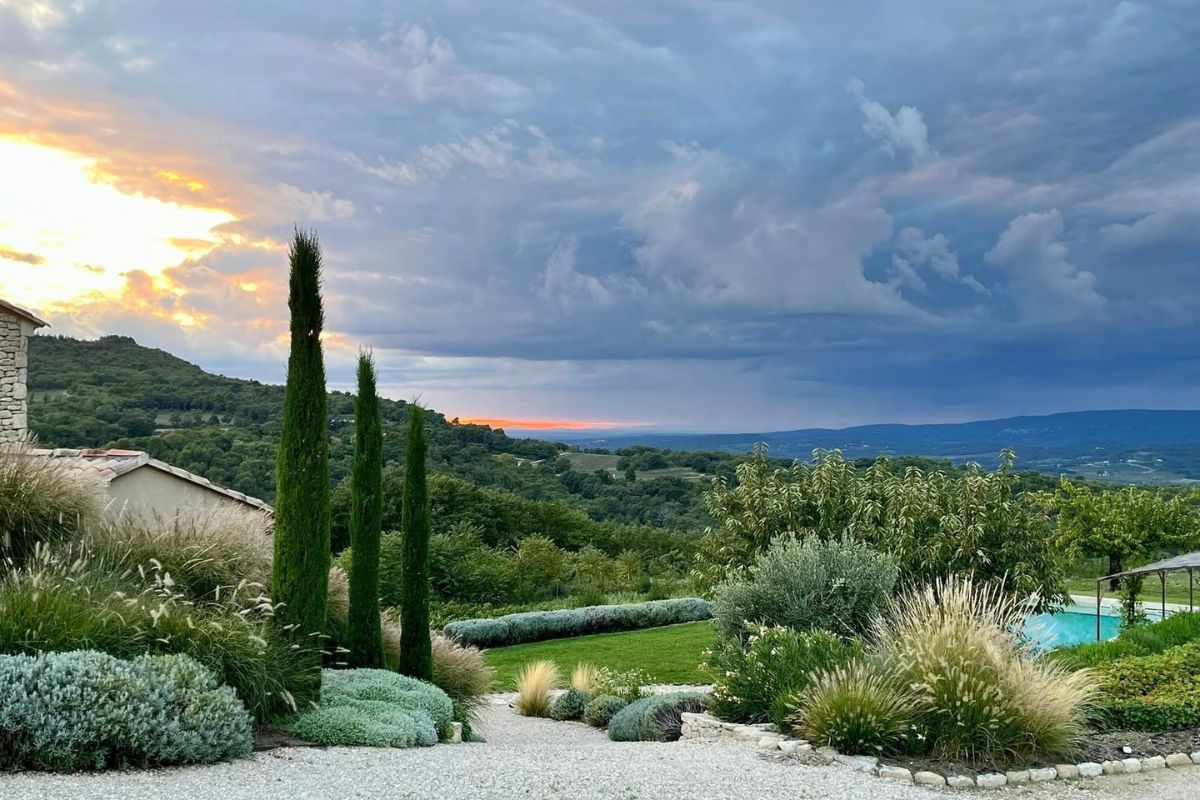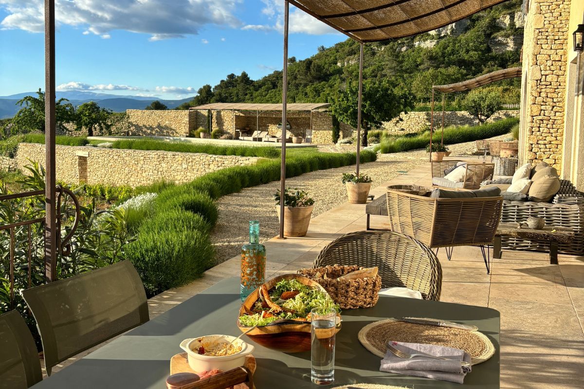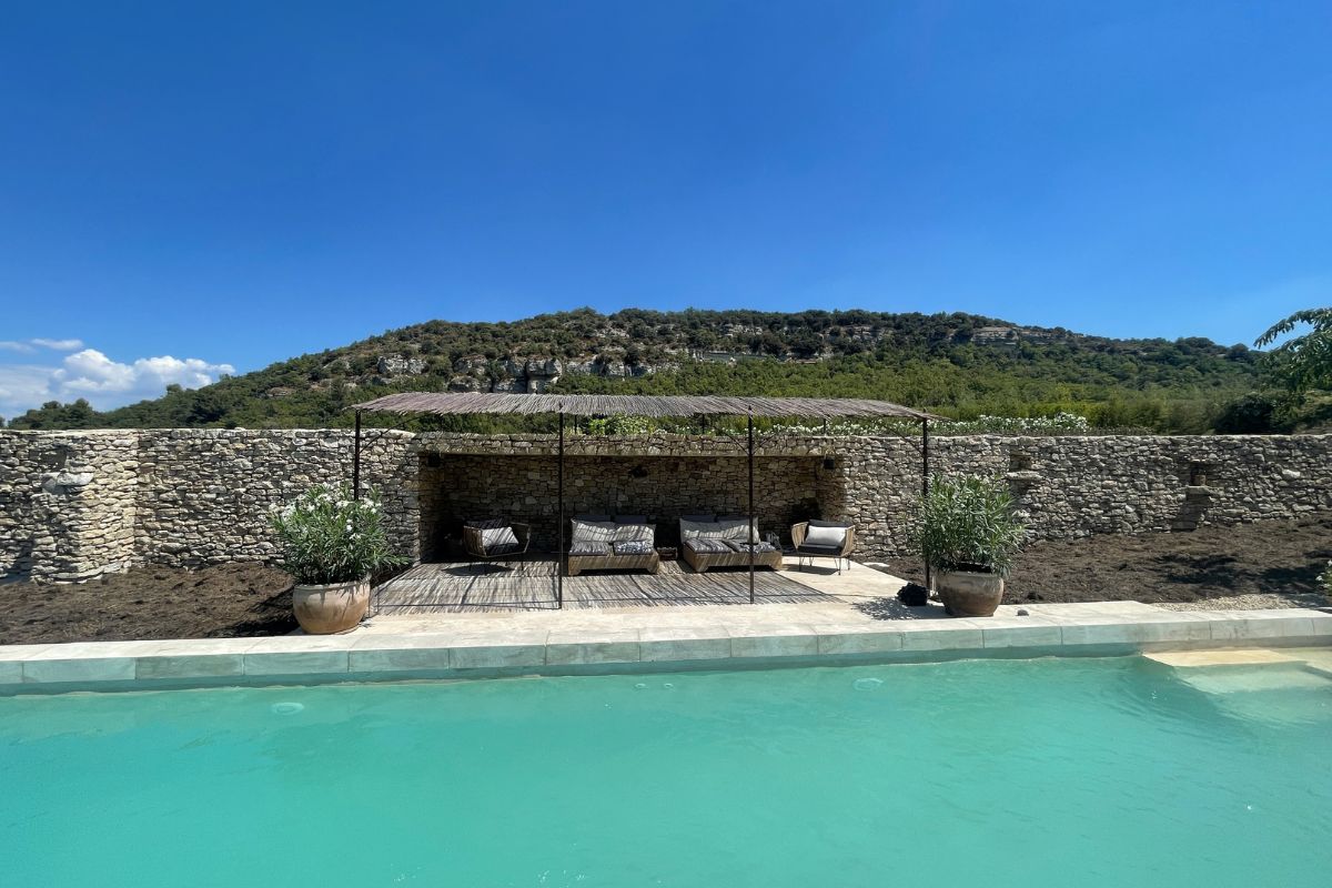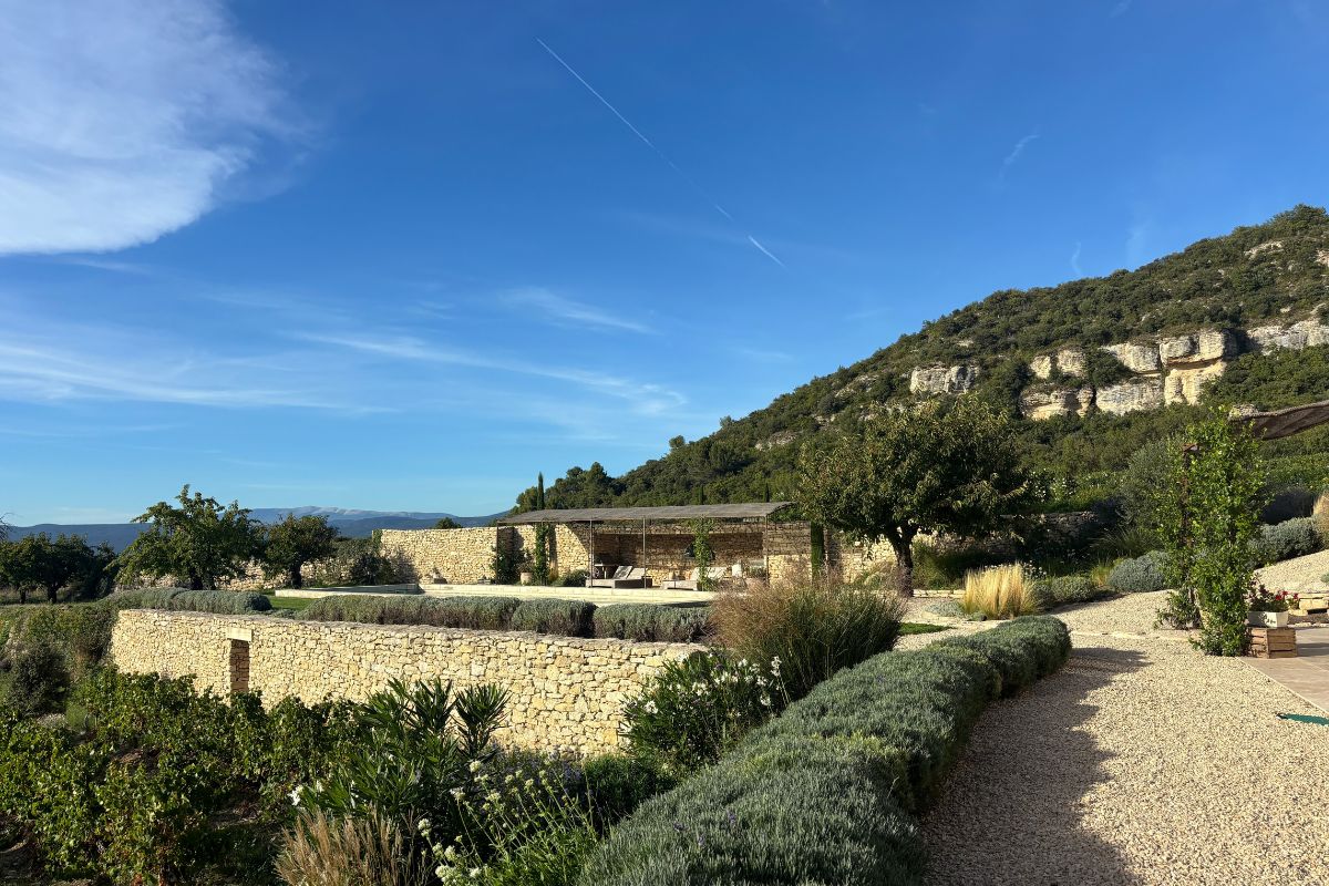 Perched high on a mountainside yet just 5–10 minutes from various villages, this exceptional stone mas sits on 8,784 m² of private land with sweeping views across the valley, cliffs, and Mont Ventoux that stretch in nearly every direction.