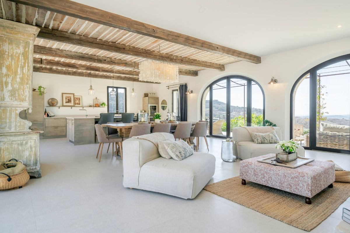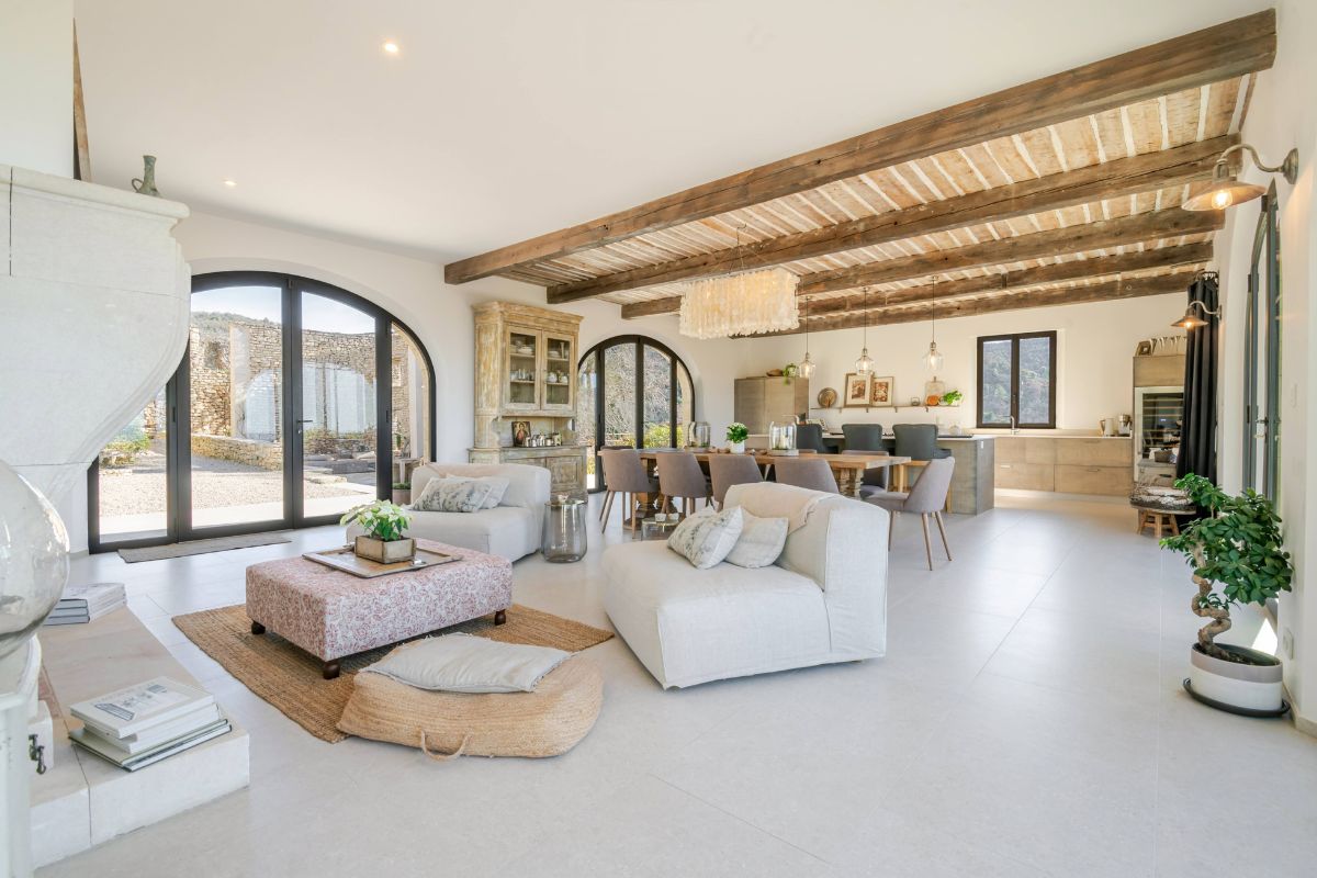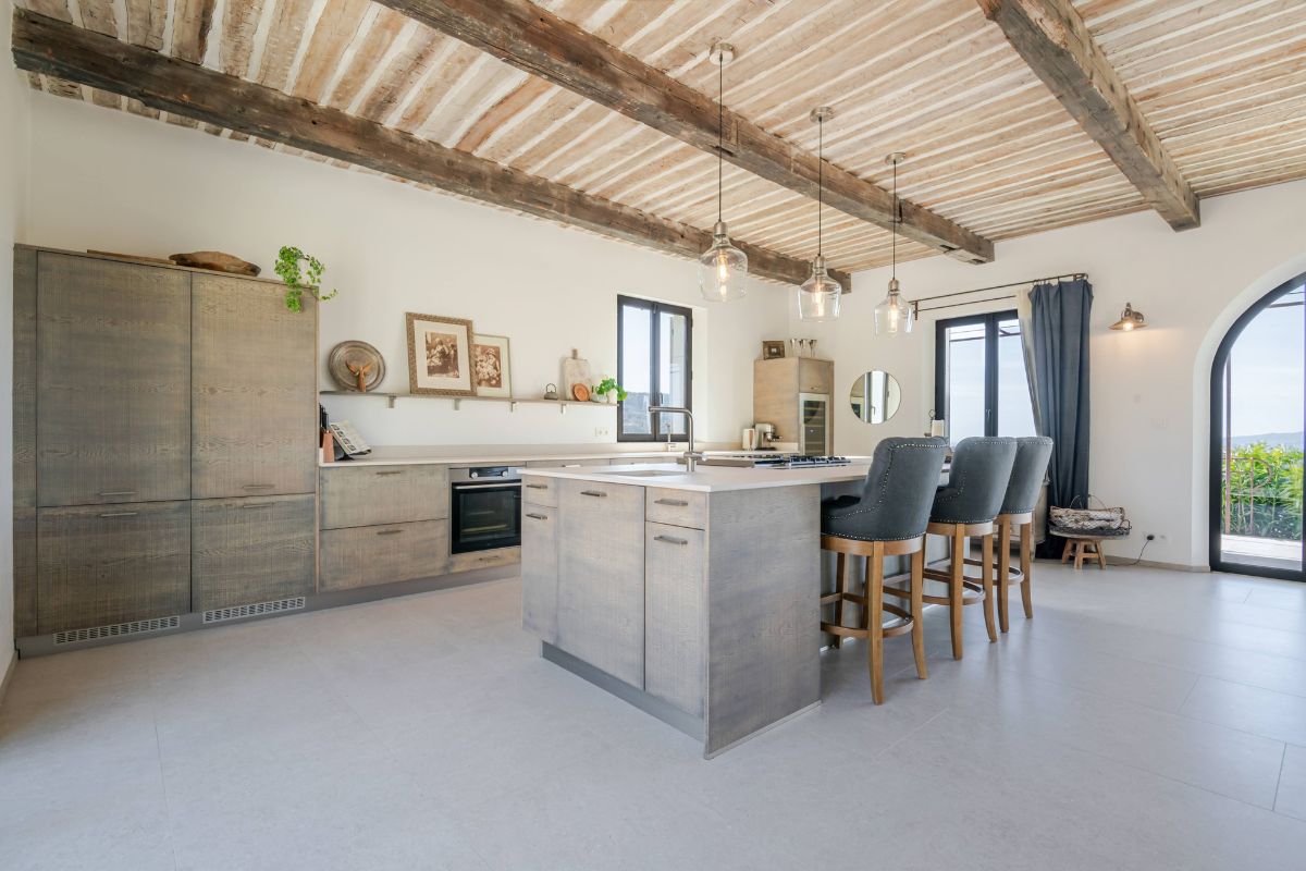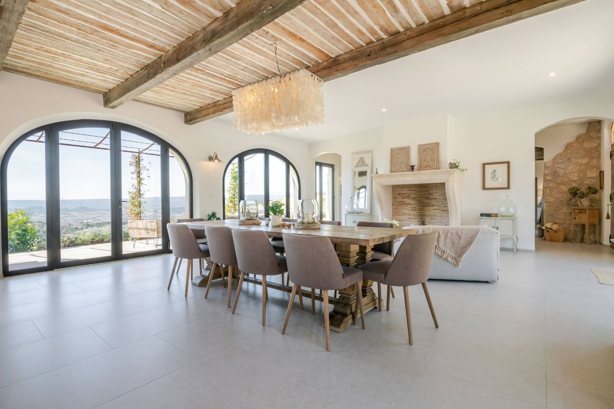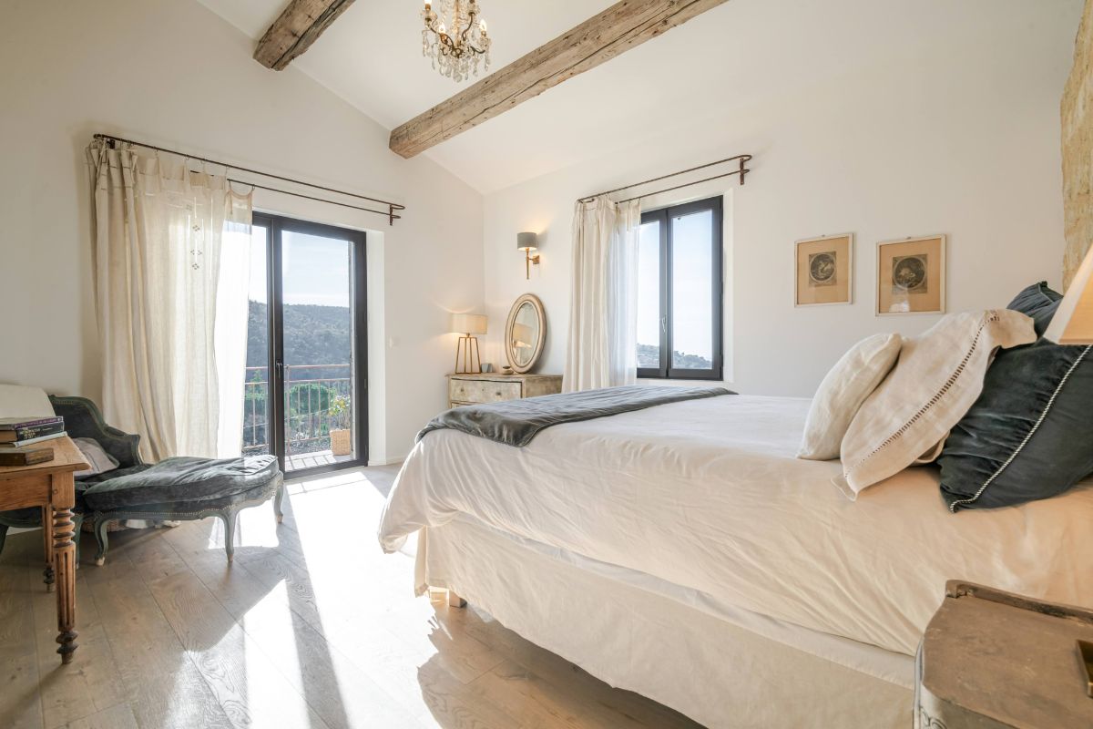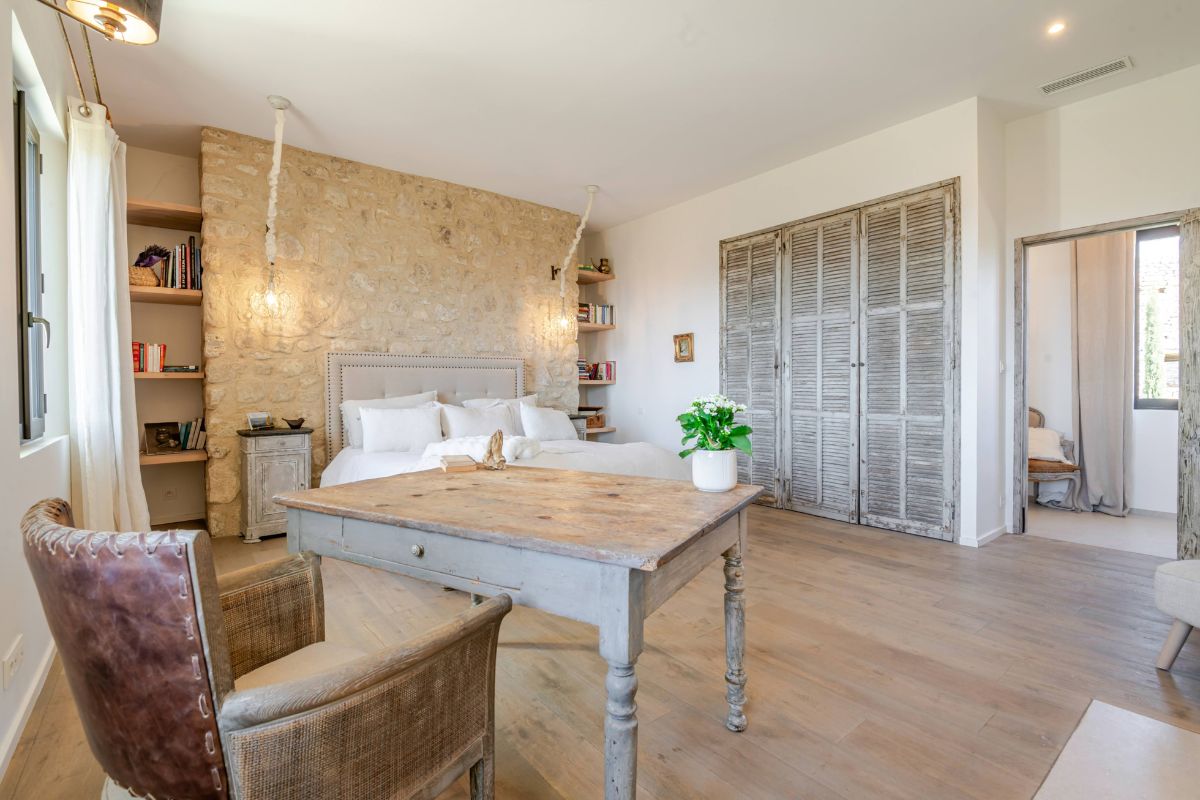 Built in 2019 within the preserved remains of an 18th-century bastide, the 250 m² main house achieves a rare balance of character and comfort — wooden beams, antique doors, and Italian fixtures alongside underfloor heating and cooling, forced-air climate control, and fiber optic internet. Four en-suite bedrooms, generous glazing throughout, and large terraces oriented to the views make this a property that lives as beautifully as it photographs.