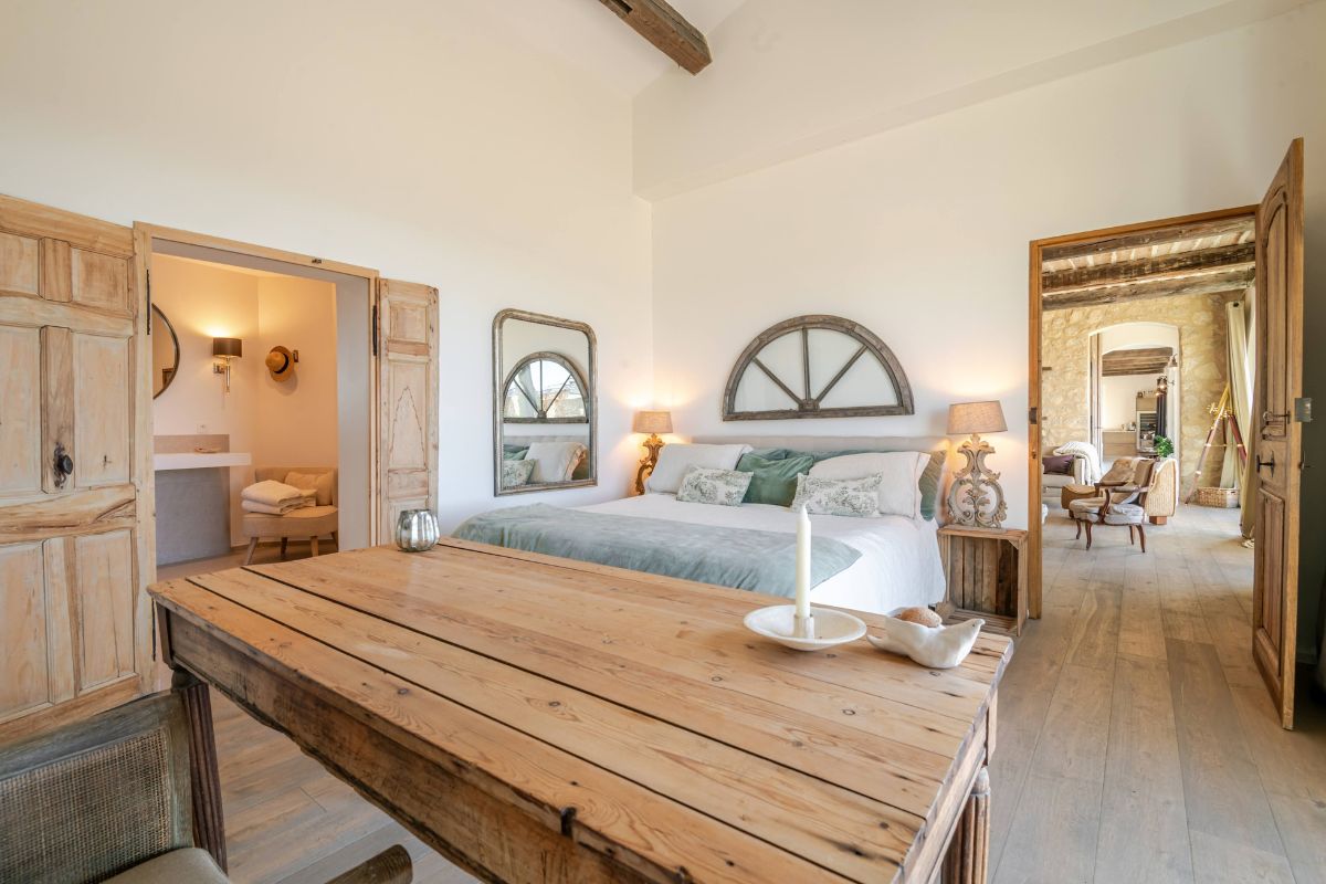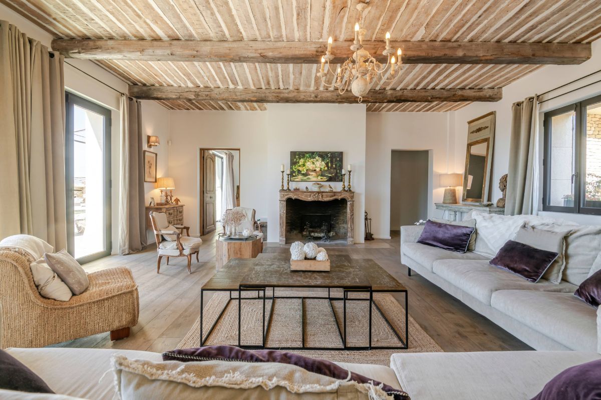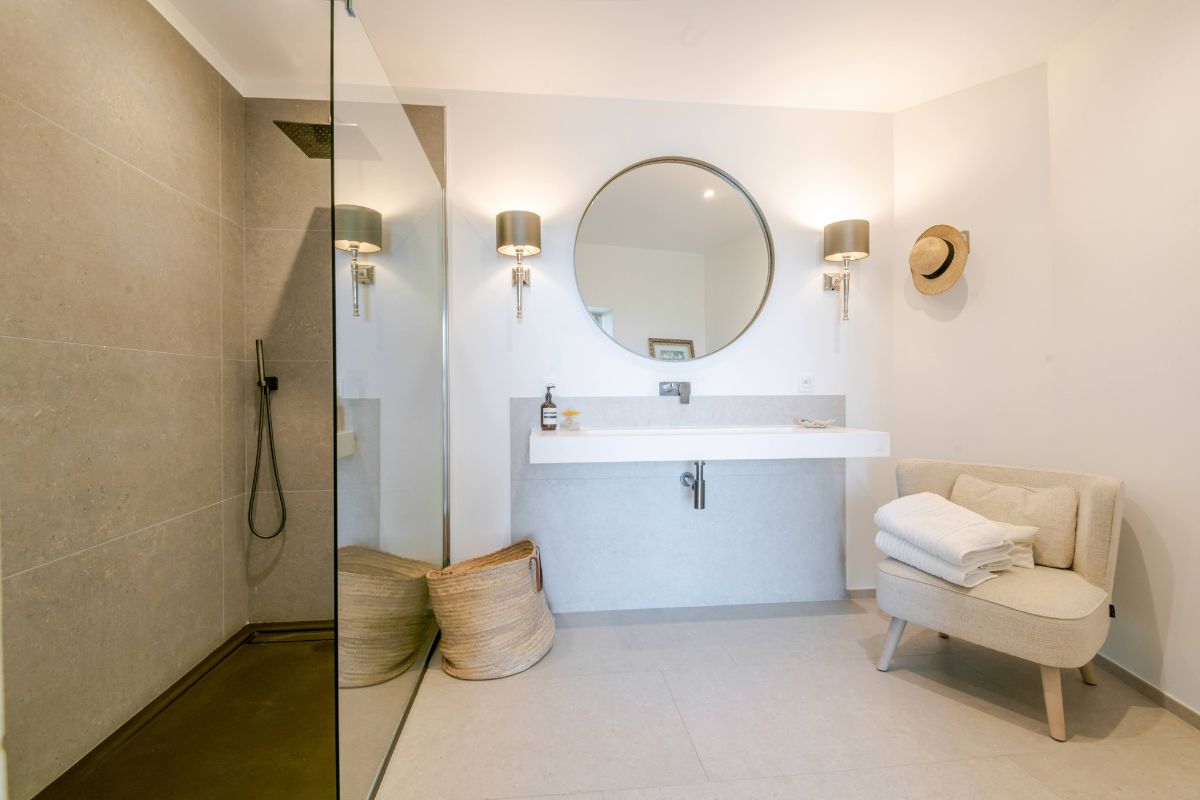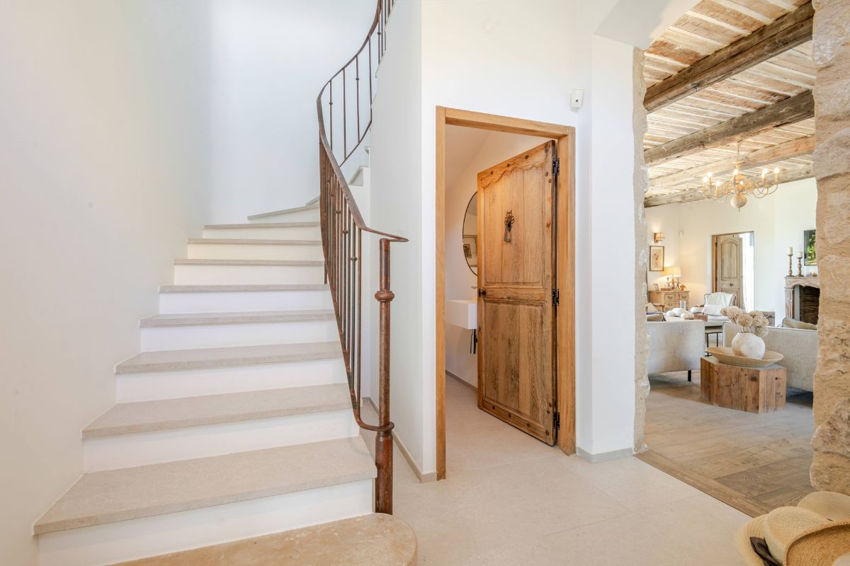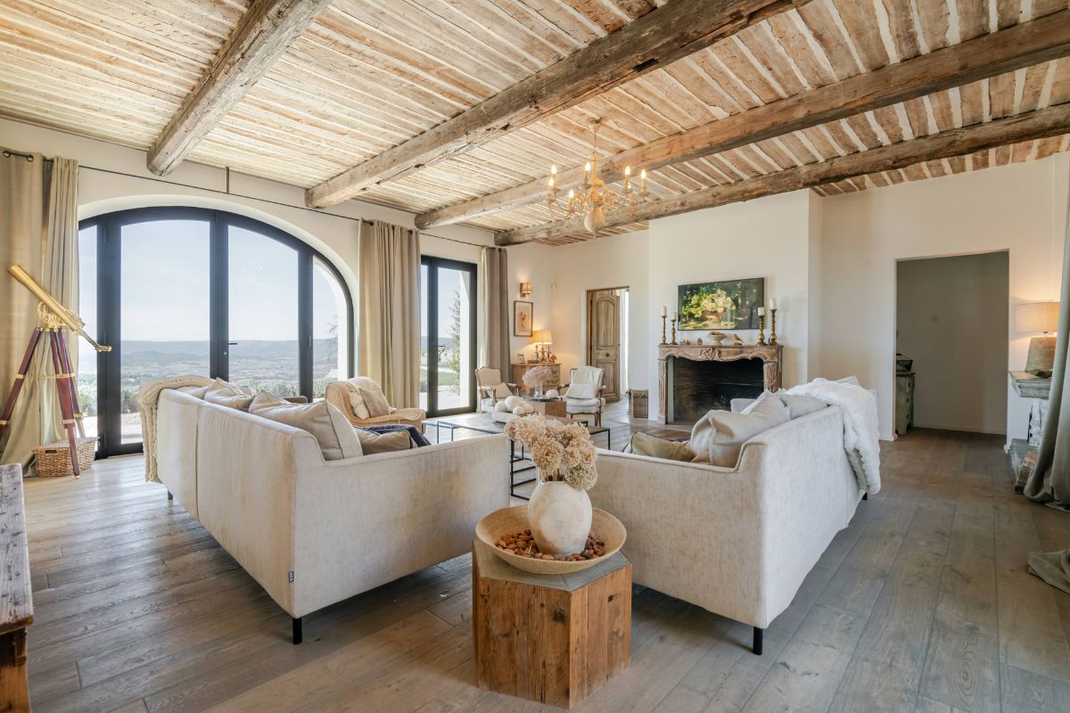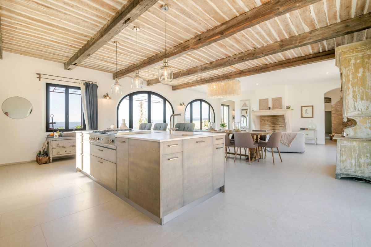 Built in 2019 within the preserved remains of an 18th-century bastide, the 250 m² main house achieves a rare balance of character and comfort — wooden beams, antique doors, and Italian fixtures alongside underfloor heating and cooling, forced-air climate control, and fiber optic internet. Four en-suite bedrooms, generous glazing throughout, and large terraces oriented to the views make this a property that lives as beautifully as it photographs.