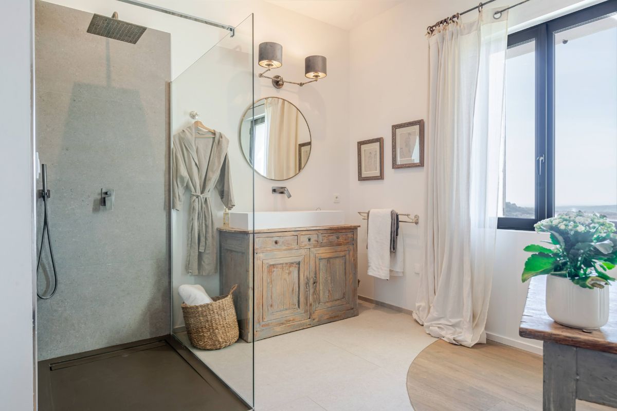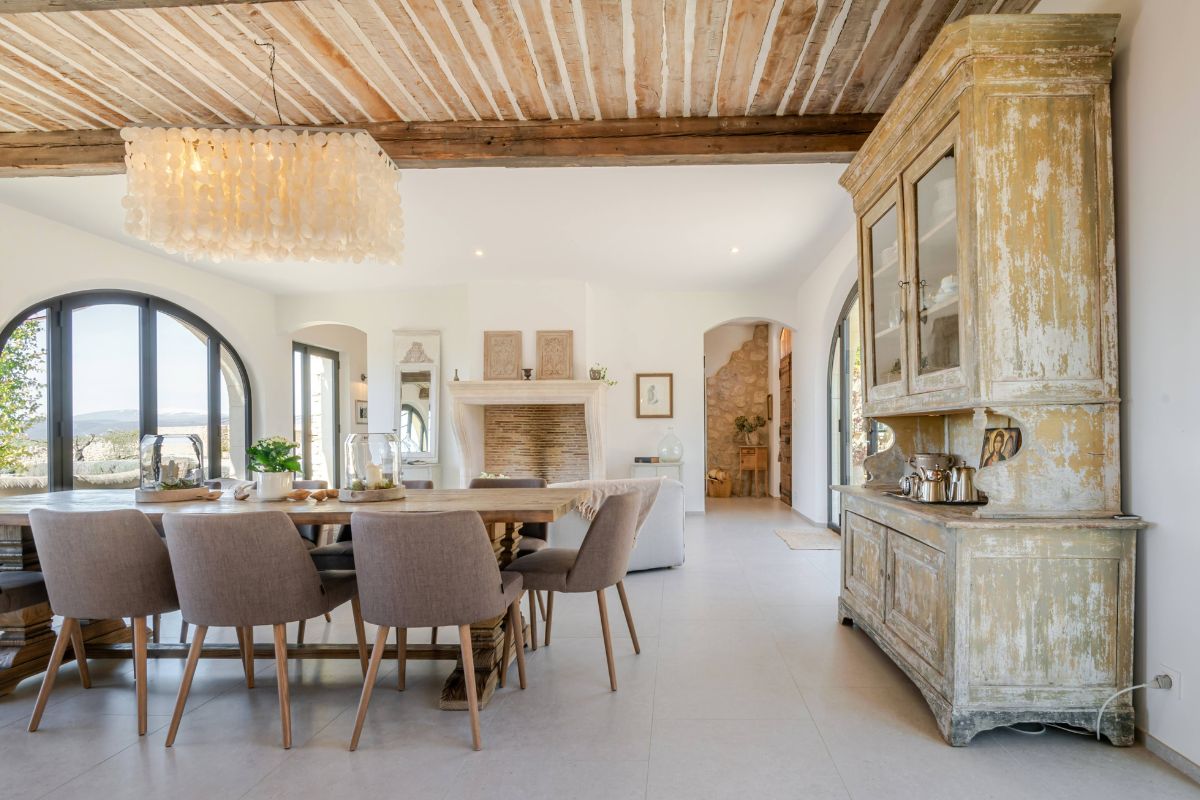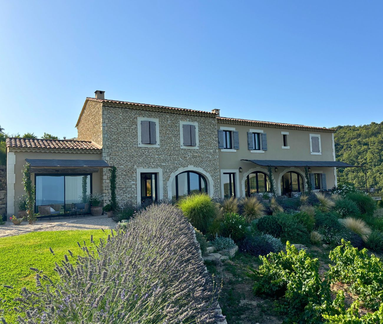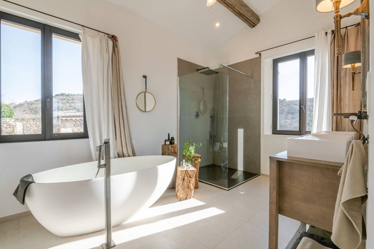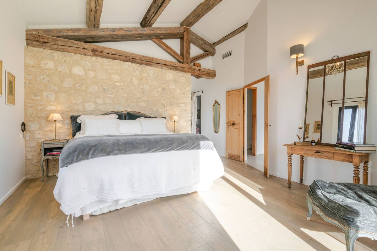 Built in 2019 within the preserved remains of an 18th-century bastide, the 250 m² main house achieves a rare balance of character and comfort — wooden beams, antique doors, and Italian fixtures alongside underfloor heating and cooling, forced-air climate control, and fiber optic internet. Four en-suite bedrooms, generous glazing throughout, and large terraces oriented to the views make this a property that lives as beautifully as it photographs.