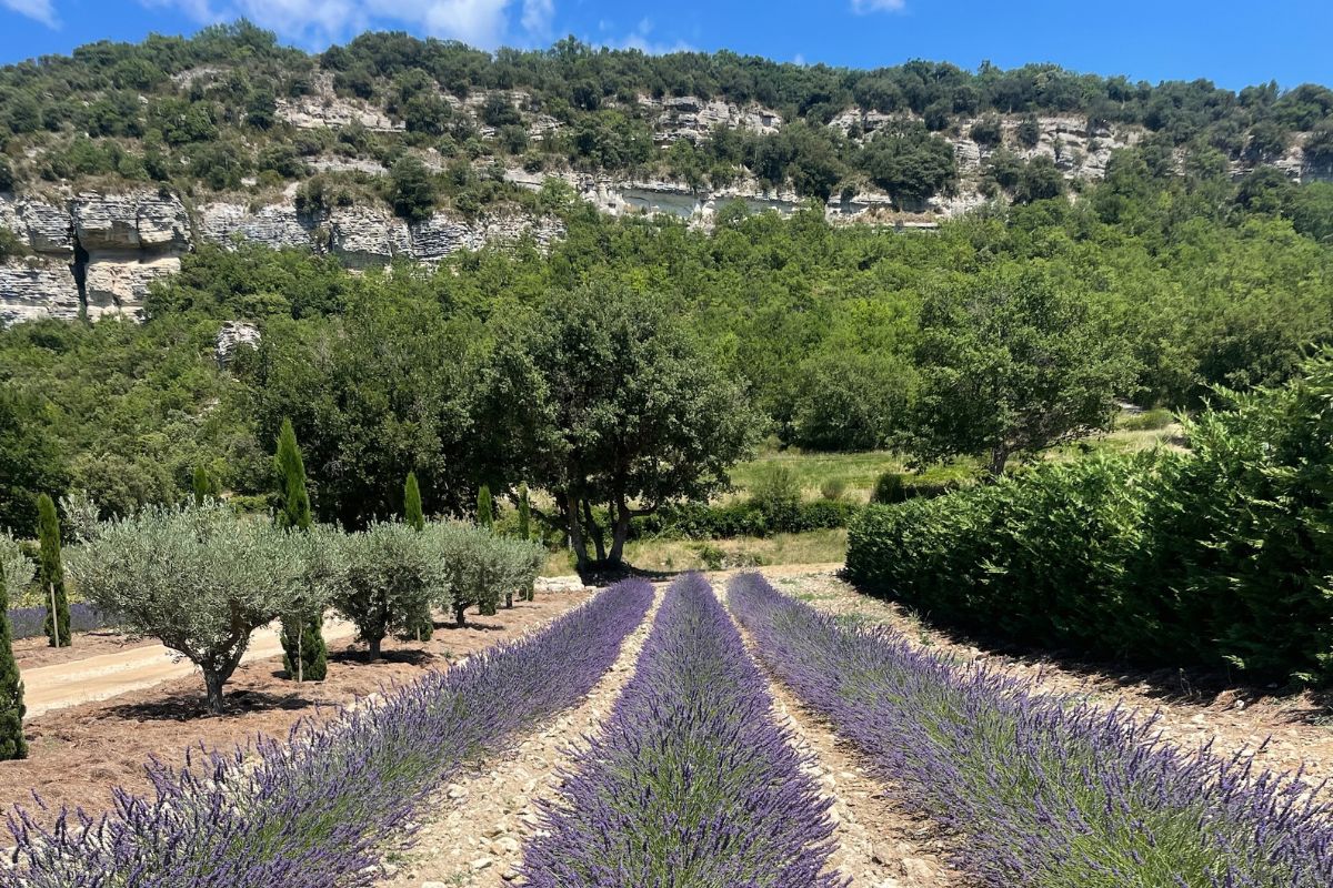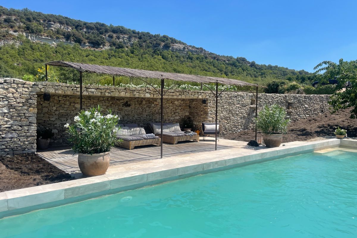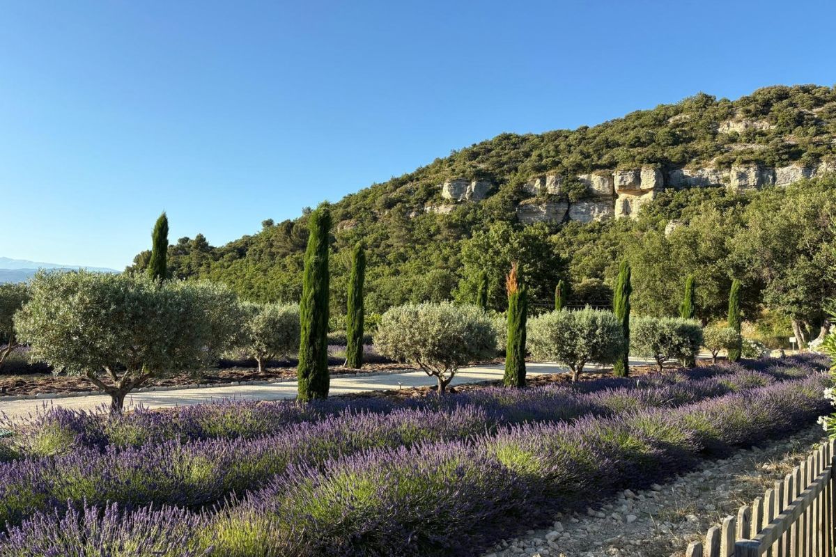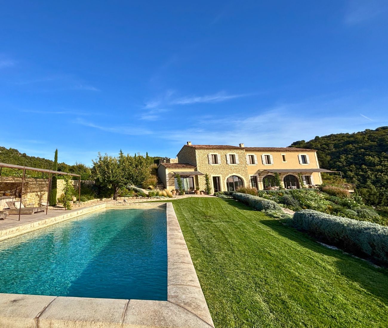 The 5×15m heated pool sits beneath a covered stone terrace. The grounds include a lavender field, AOC grapevines, an almond grove, cherry trees, a large vegetable garden, and a cypress-and-olive-lined entrance drive. Irrigation is supplied by Canal de Provence water; the house runs on town water with a full softening system.